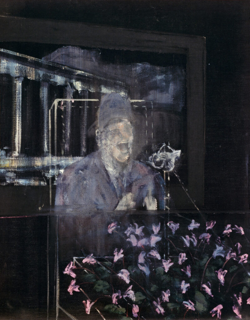 In April, Three Studies for Figures at the Base of a Crucifixion (1944) and Figure in a Landscape (1945) are exhibited at a group show at the Lefevre Gallery, London. The triptych makes waves among London art connoisseurs and prefigures the artist’s radical and uncompromising body of work.